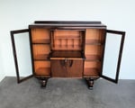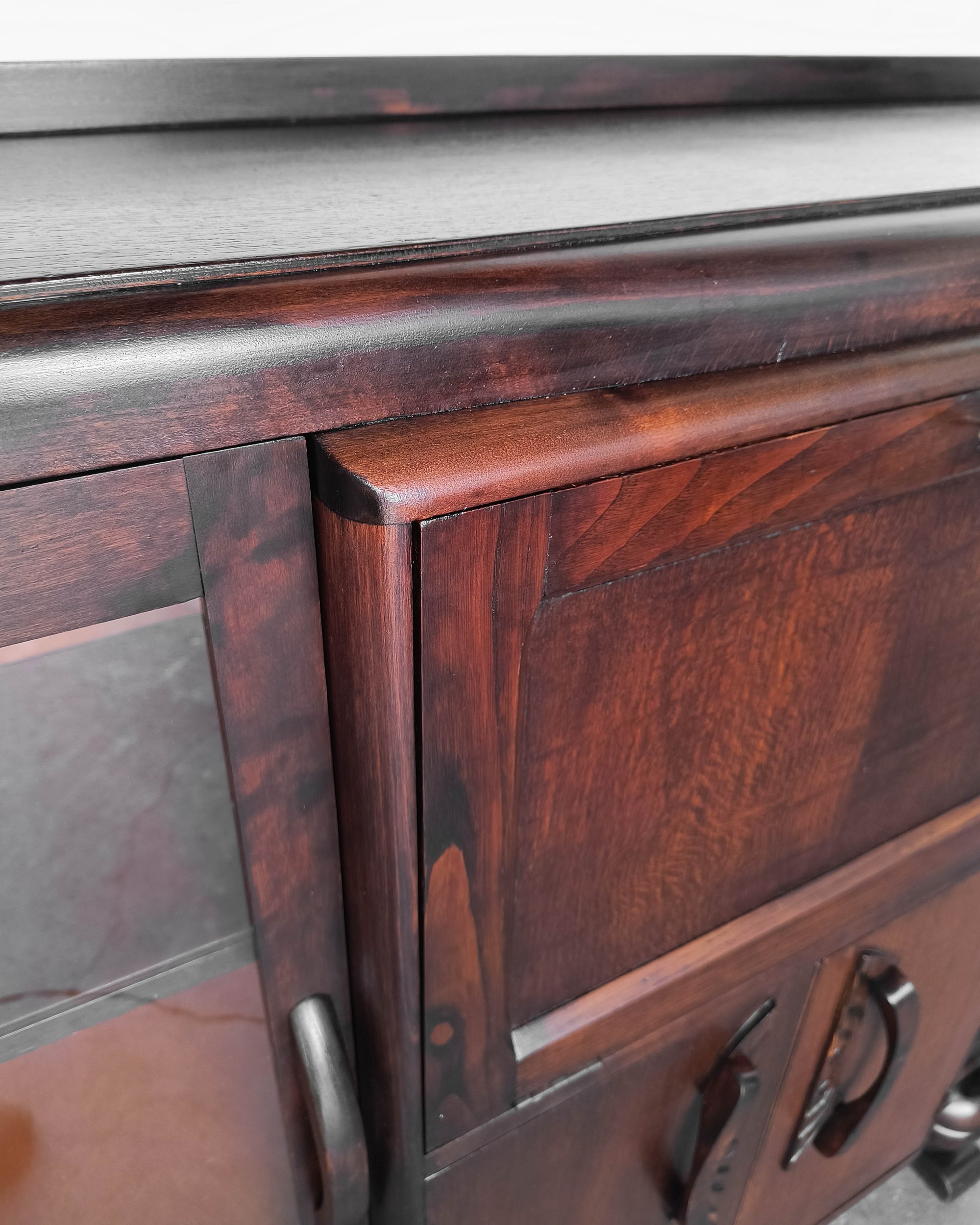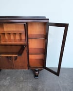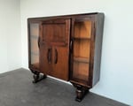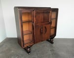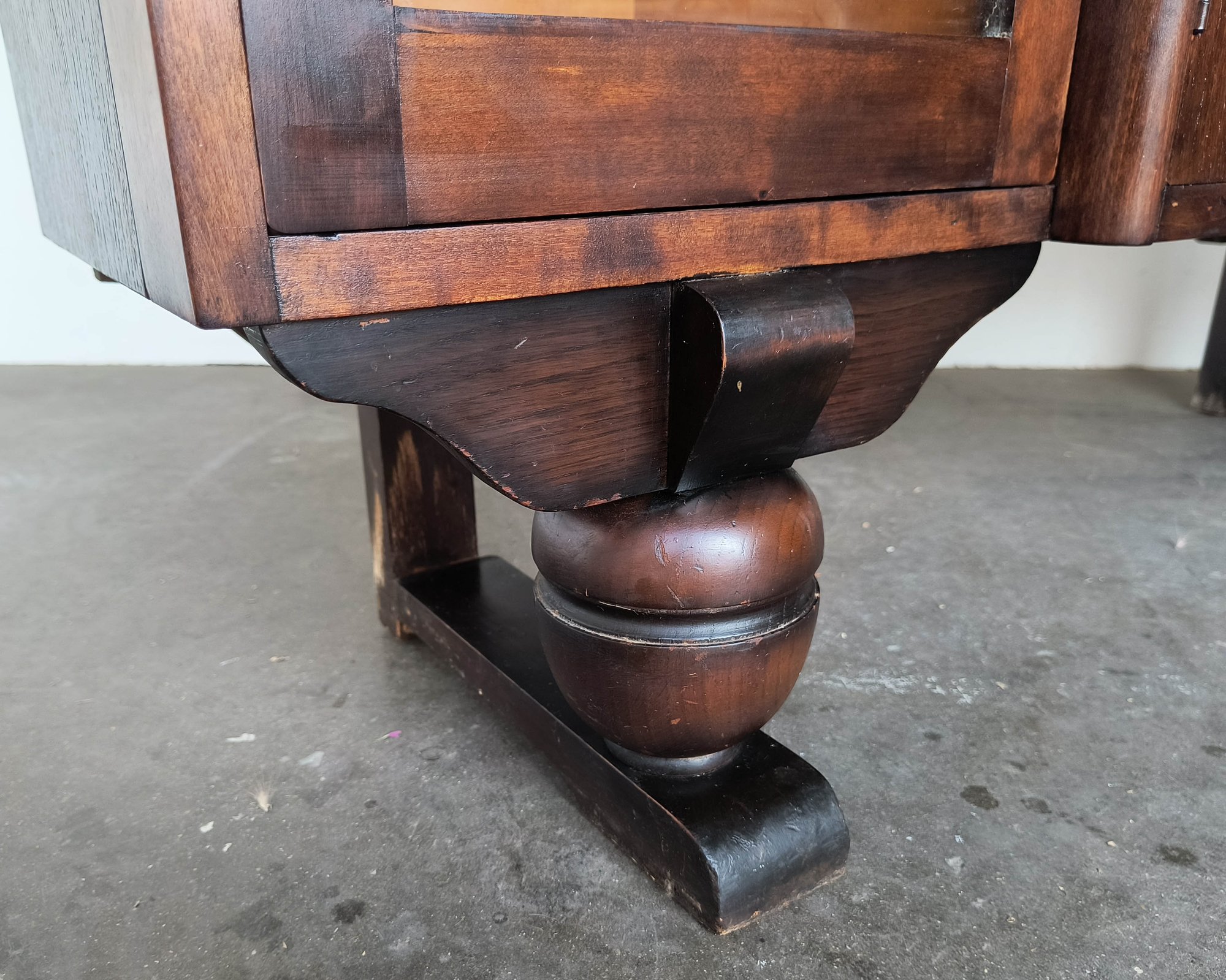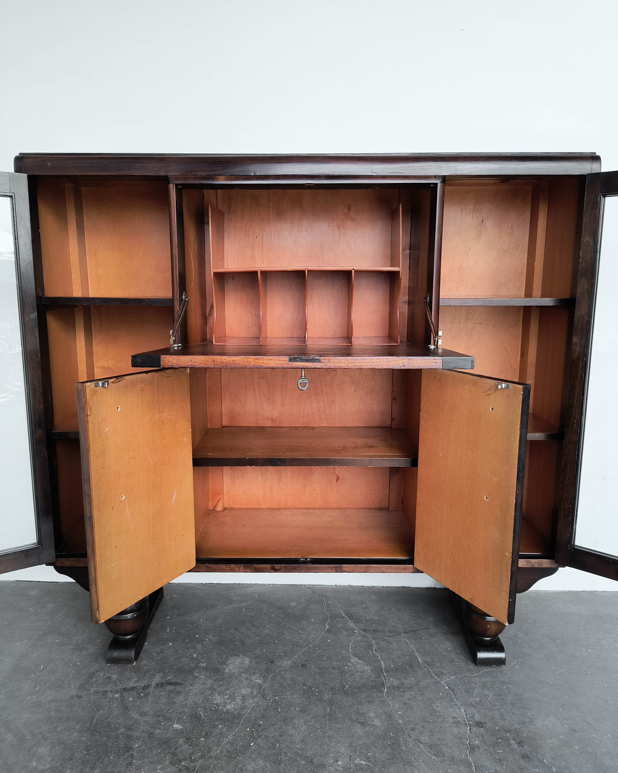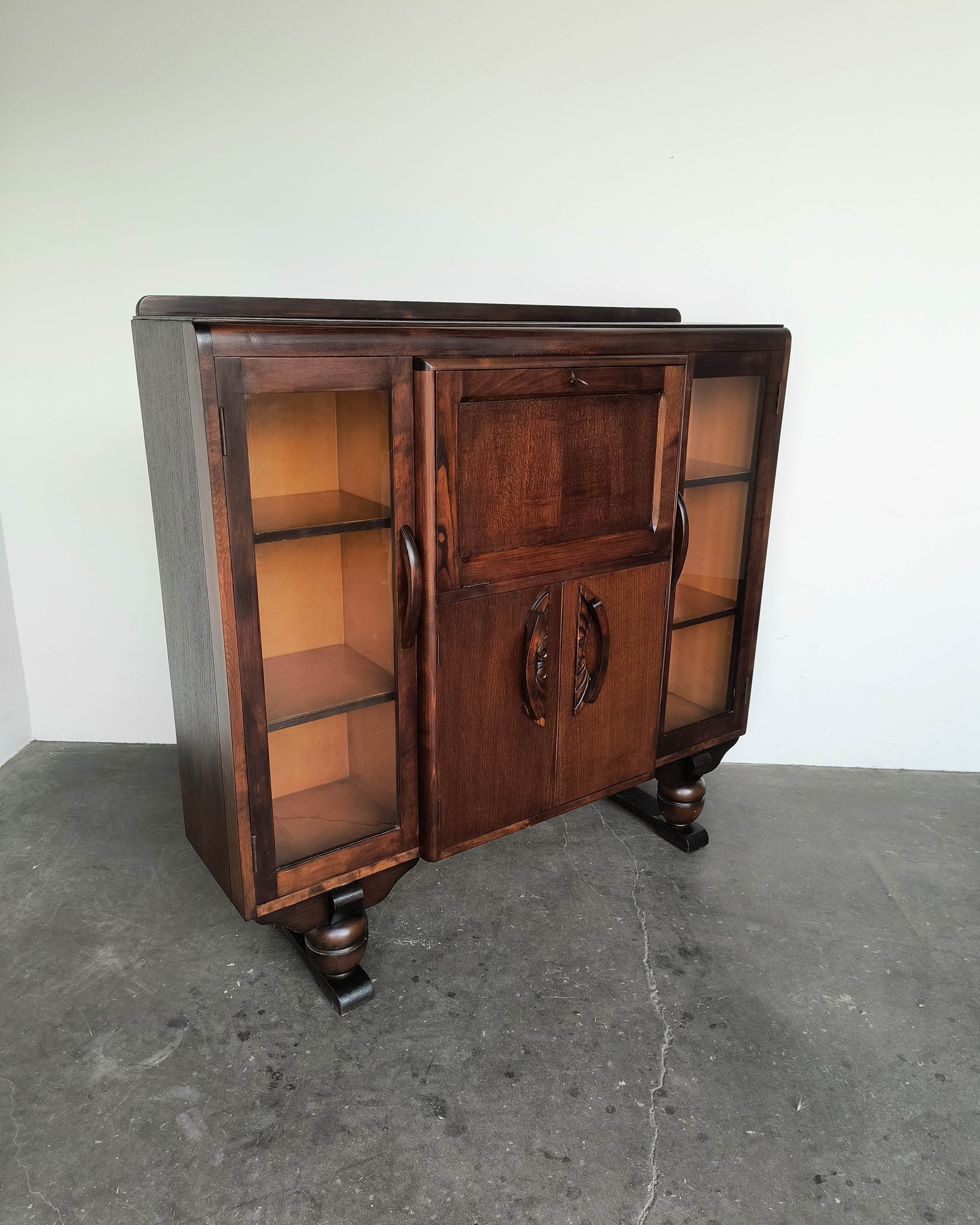 Beautiful vintage Art Deco display cabinet circa 1930s. Featuring stunning carved wood detailing, glass-front side doors with internal shelving, and a drop-down surface above double cabinet doors, this piece is both functional and decorative. Rich oak wood tones and elegant bun legs. Great vintage condition with light wear consistent with age.