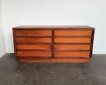 Brown Saltman mid-century modern dresser features a warm walnut finish and clean, minimalist lines. Its eight drawers offer generous storage, each designed with sculpted integrated pulls for a sleek, seamless look. Orginal drawer liner inside. Overall great condition, some very light wear, a couple of blemishes on top (see photos).