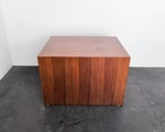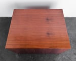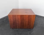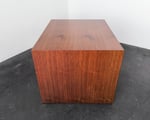 Refinished walnut wood minimalist side table with a clean, cube-like design. It features a rich walnut veneer with vertical grain patterns that enhance its warm, natural aesthetic. The table sits flush to the floor with discreet feet. Overall great condition.