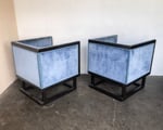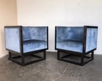 Pair of rare original 'Cabinet Chairs' by Josef Hoffmann handmade circa 1980s by Wittmann Austria. Designed in 1903, for the Vienna home of Dr. Salzer, Josef Hoffmann's cabinet chairs are a timeless design. The rationalist cube form is made comfortable with the upholstered interior that's covered in the original blue velvet fabric. The curvilinear design of the fabric is the perfect counterpoint to the rectilinear dark mahogany frames of the chairs. Structurally great condition. Lots of wear and tear throughout as shown in photos, frames and upholstery would benefit from restoration. Matching loveseat available as well.