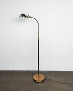 Vintage two-tone gooseneck floor lamp with a chrome dome shade, brass detailing, and an adjustable arm with rotary switch. Features a weighted round base and articulated neck for directional reading light. Overall good vintage condition with visible patina and wear to the brass consistent with age and use.